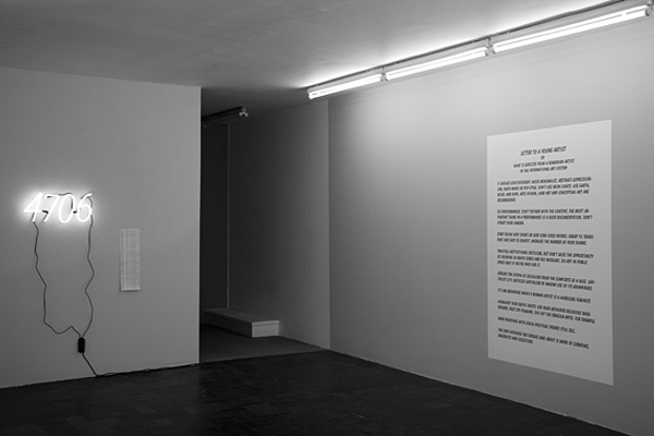 The work quotes Rainer Maria Rilke’s Letters to a Young Poet. Tailored for the reality of the contemporary art scene in Romania, the work dissects how, in order to be integrated, young artists must mould themselves according to the expectations of the Western scene. The text indirectly unveils the enormous differences between the Western developed art system and the almost inexistent Romanian one.