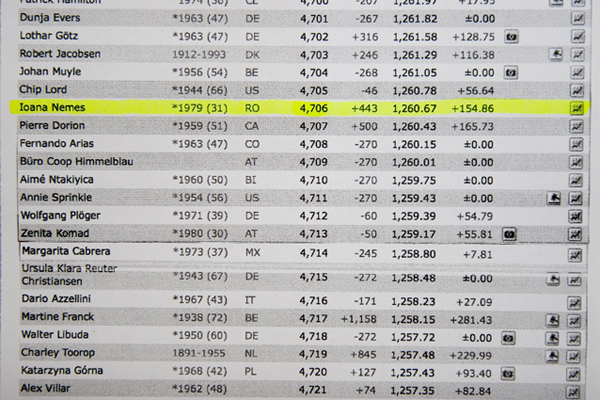 4706 represents the place Ioana Nemes occupies in Artfacts.Net ranking, an online guide of modern and contemporary art. Gathering info from the web, the guide attempts to forecast an artist’s carrier according to the number and importance of the exhibitions the artist had until that point. Artfacts.Net operates on the basis of the economy of attention principle, a term developed in 1999 by Georg Franck in the same title book.