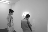 The black-and-white painting is a graphic visualization of the artist’s CV under the form of a constellation. It presents curators and gallerists – under the form of different sized planets – that influenced her artistic parcours.